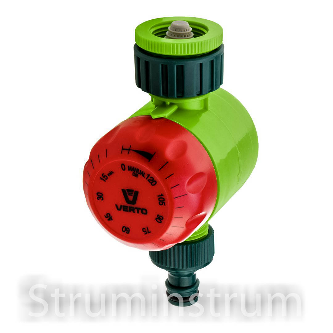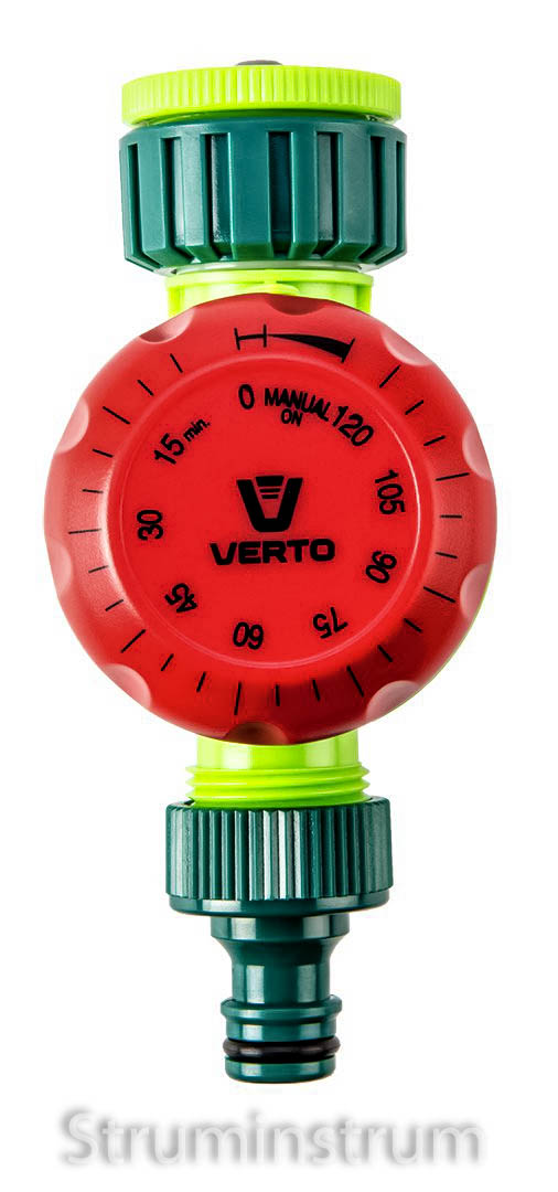 Вимикач із таймером VERTO (арт. 15G750) з можливістю повертання ручки у будь-який бік без ризика пошкодження механізму дозволяє вручну виставляти час поливу до 120 хвилин. Вимикач із таймером допускає підключення до крану 3/4".