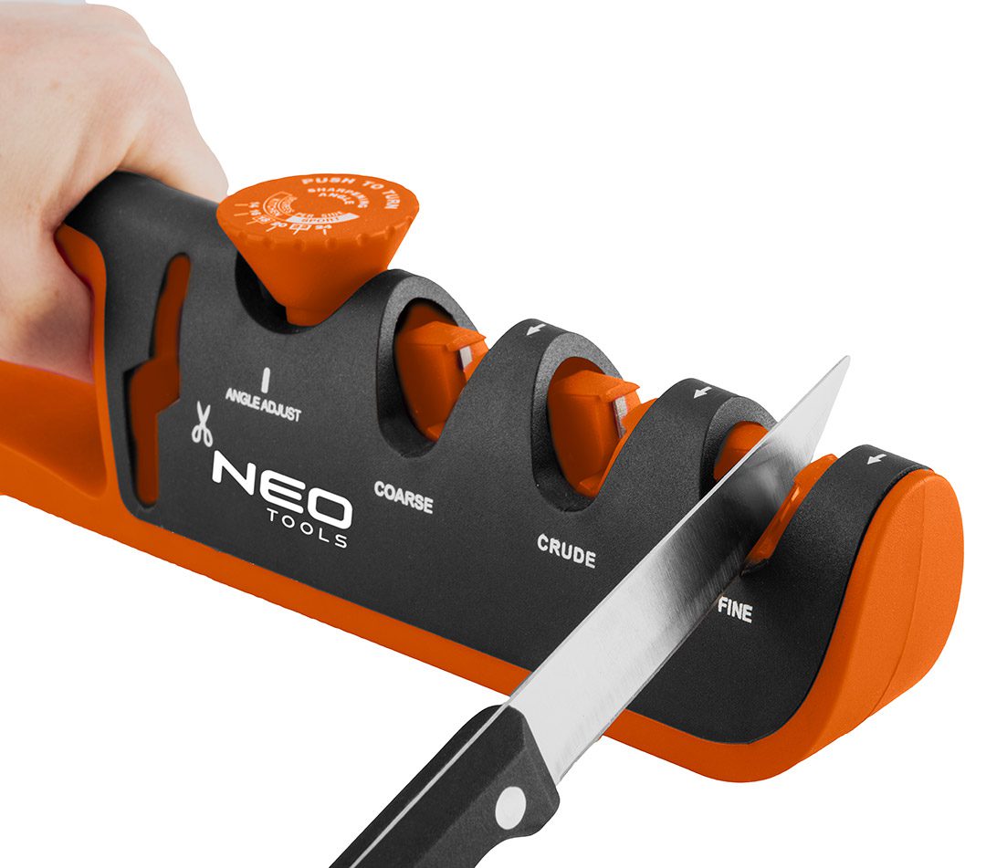 Точилка для ножів і ножиць з регулюванням кута нахилу 56-050 від NEO – це інструмент з корпусом з ударостійкого АВС-пластика, частково покритого TPR-гумою. Він пропонує триступеневу заточку ножів – початкову грубу алмазну заточку, формоутворення за допомогою твердого сплаву та фінальне керамічне полірування. Він також дозволяє заточувати ножиці за допомогою спеціального алмазного шліфувального круга. За допомогою ручки, що дозволяє вибирати кут заточування, збільшує можливості леза. Точилка оснащена нековзною основою і має ергономічну ручку. Пропонується з інструкцією з експлуатації. Продукція торгової марки NEO рекомендована для домашнього та професійного використання.