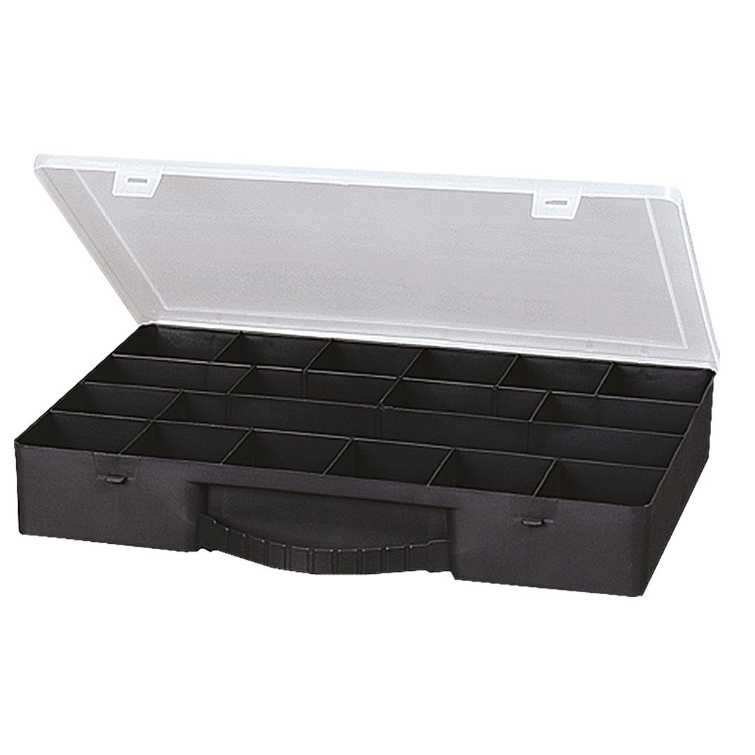 Органайзер TOPEX розмірами 36×25х5,5 см. Практичний органайзер із перегородками для зберігання дрібних елементів, напр., гвинтів, саморізів. Має ручку для переношування. Марка TOPEX адресована майстрам, які займаються дрібним ремонтом.