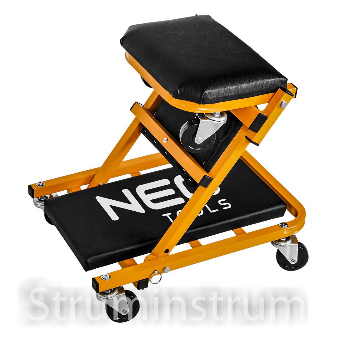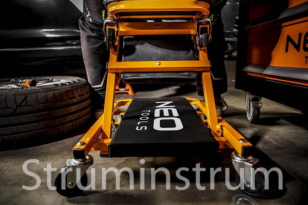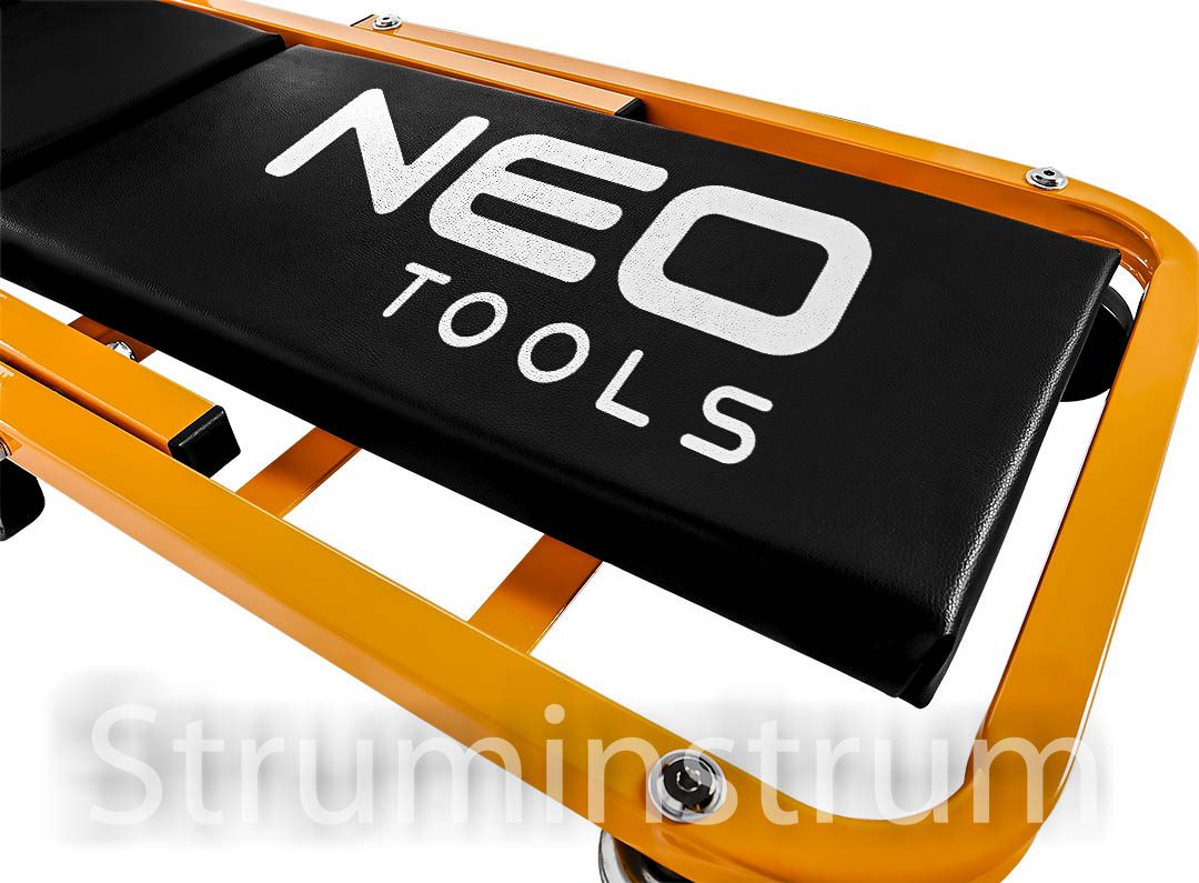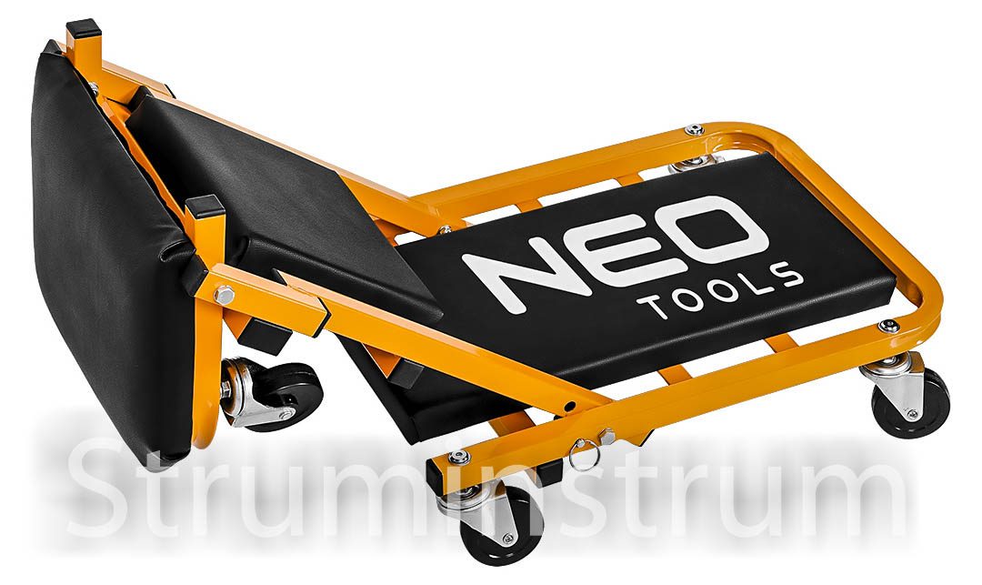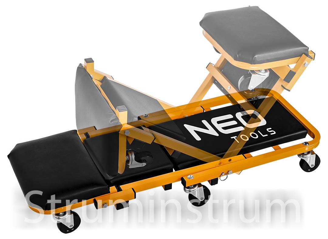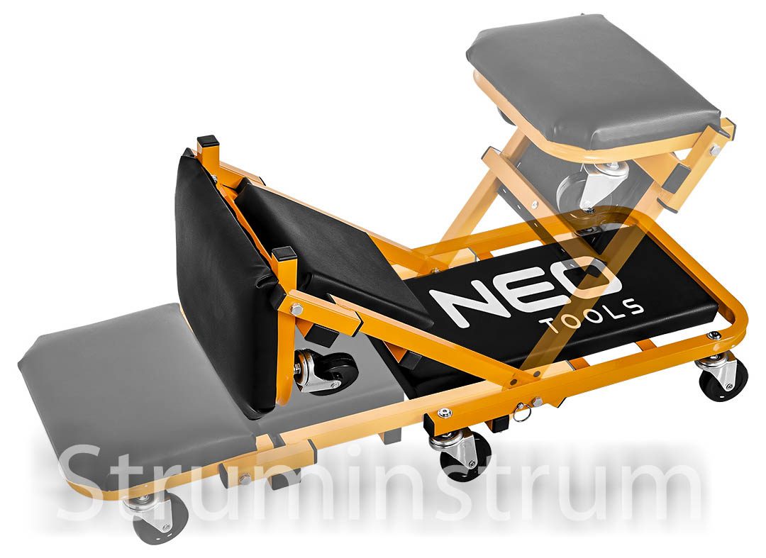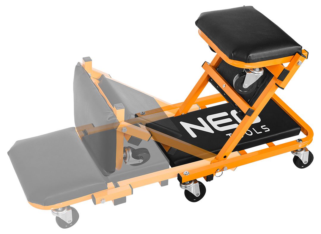 Візок – підкатний лежак NEO 11-601-1 — універсальний інструмент 2-в-1 для автомайстерні, який легко трансформується на зручний табурет. Це оновлена модель, що вирізняється посиленою конструкцією в ділянках підголівника та спинки, а також вдосконаленими колесами діаметром 75 мм. Колеса виготовлені з поліпропілену, обробленого термополіуретановим еластомером, який витримує вплив мастил та забезпечує амортизацію при русі.