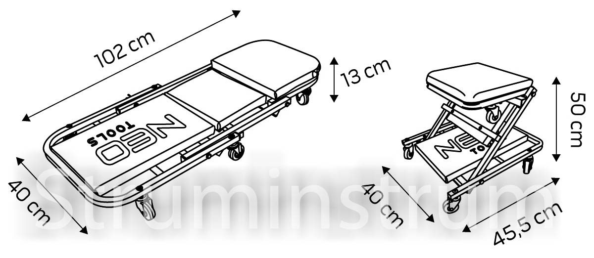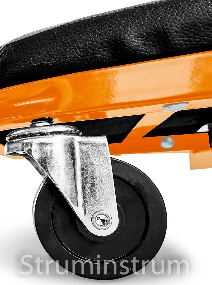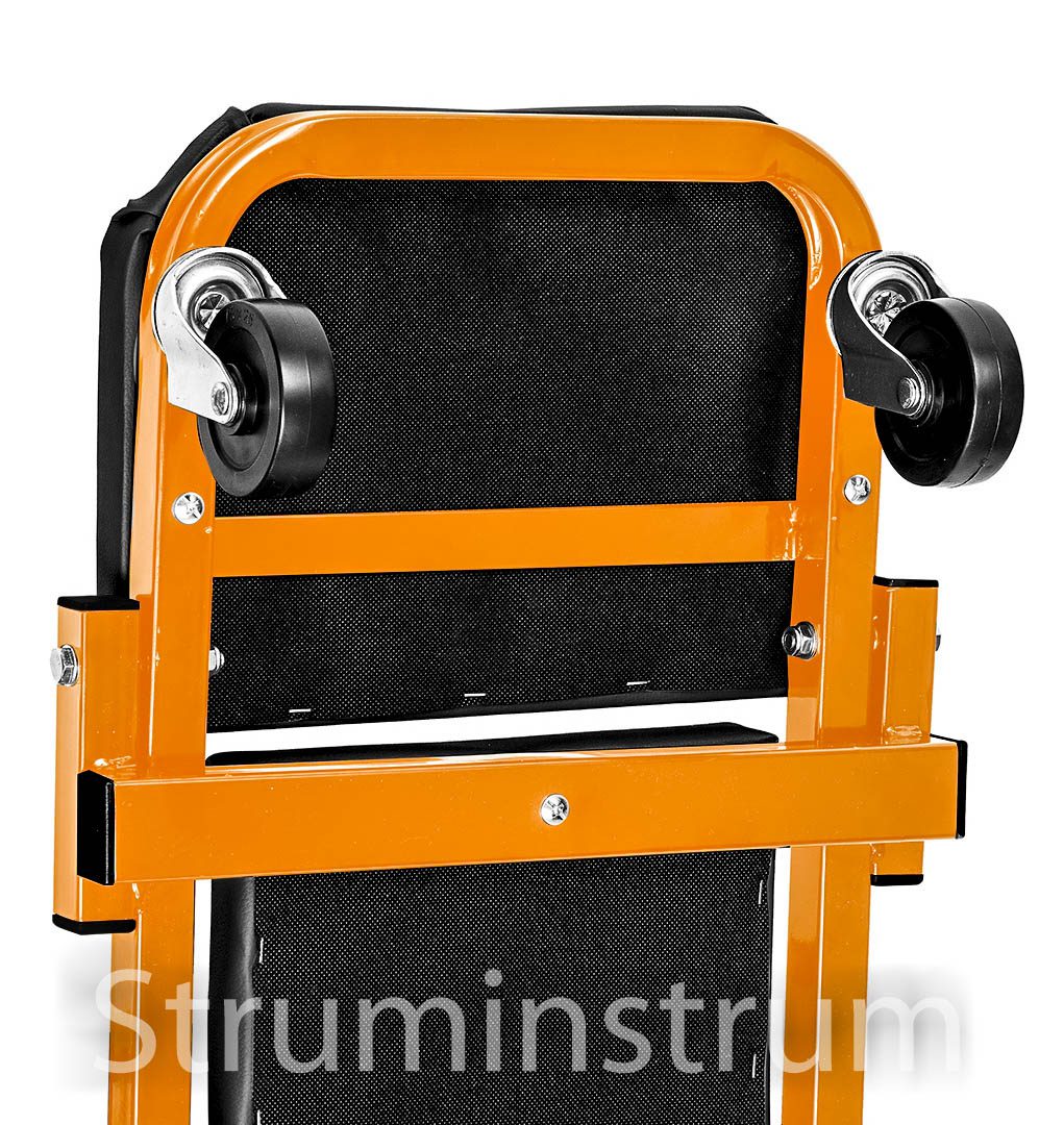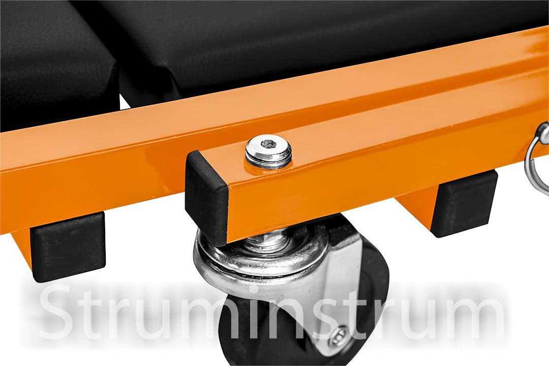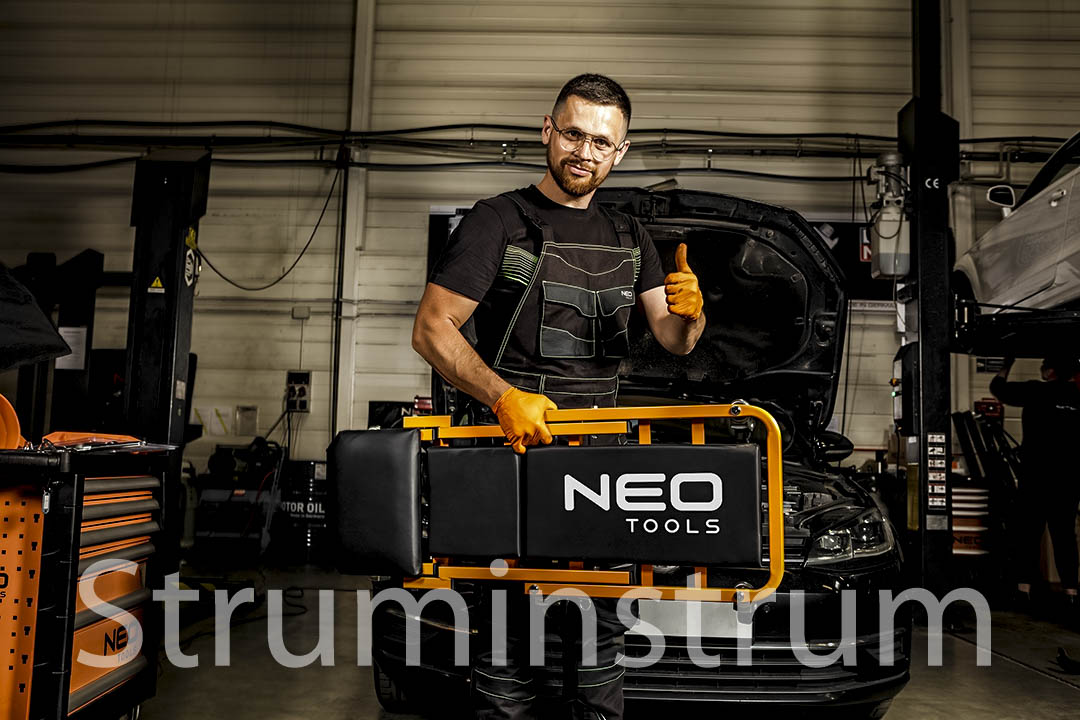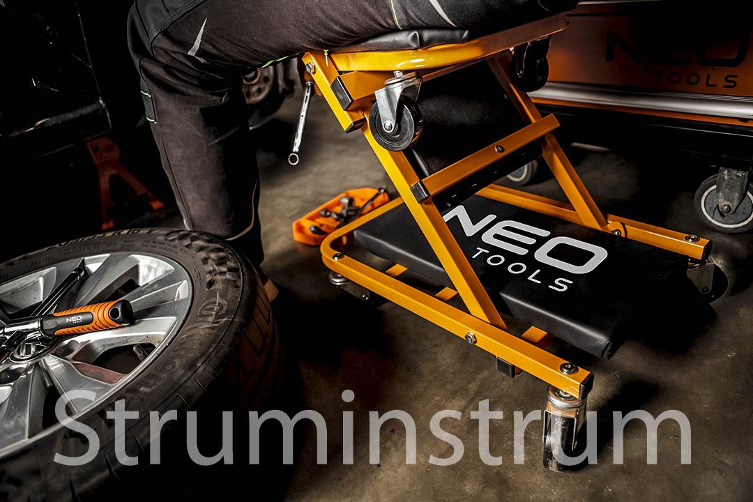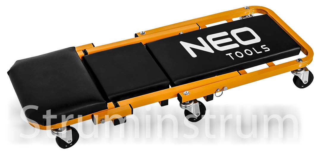 Візок – підкатний лежак NEO 11-601-1 — універсальний інструмент 2-в-1 для автомайстерні, який легко трансформується на зручний табурет. Це оновлена модель, що вирізняється посиленою конструкцією в ділянках підголівника та спинки, а також вдосконаленими колесами діаметром 75 мм. Колеса виготовлені з поліпропілену, обробленого термополіуретановим еластомером, який витримує вплив мастил та забезпечує амортизацію при русі.