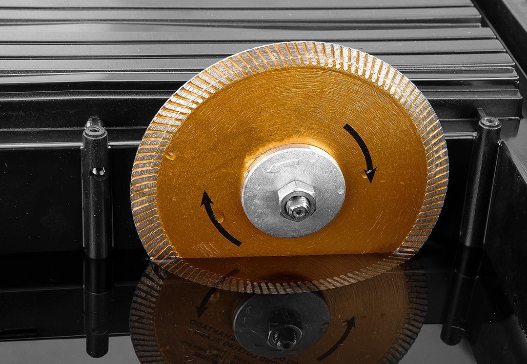 Плиткоріз акумуляторний 5000 об/хв GRAPHITE — 18 В, диск 110×7×22.2 мм, глибина різу: 24 мм (90°) / 16 мм (45°), бак для води, робоча поверхня 370×390×112 мм, ABS, напрямна, кутомір, кожух, 2 ключі, для Energy+.