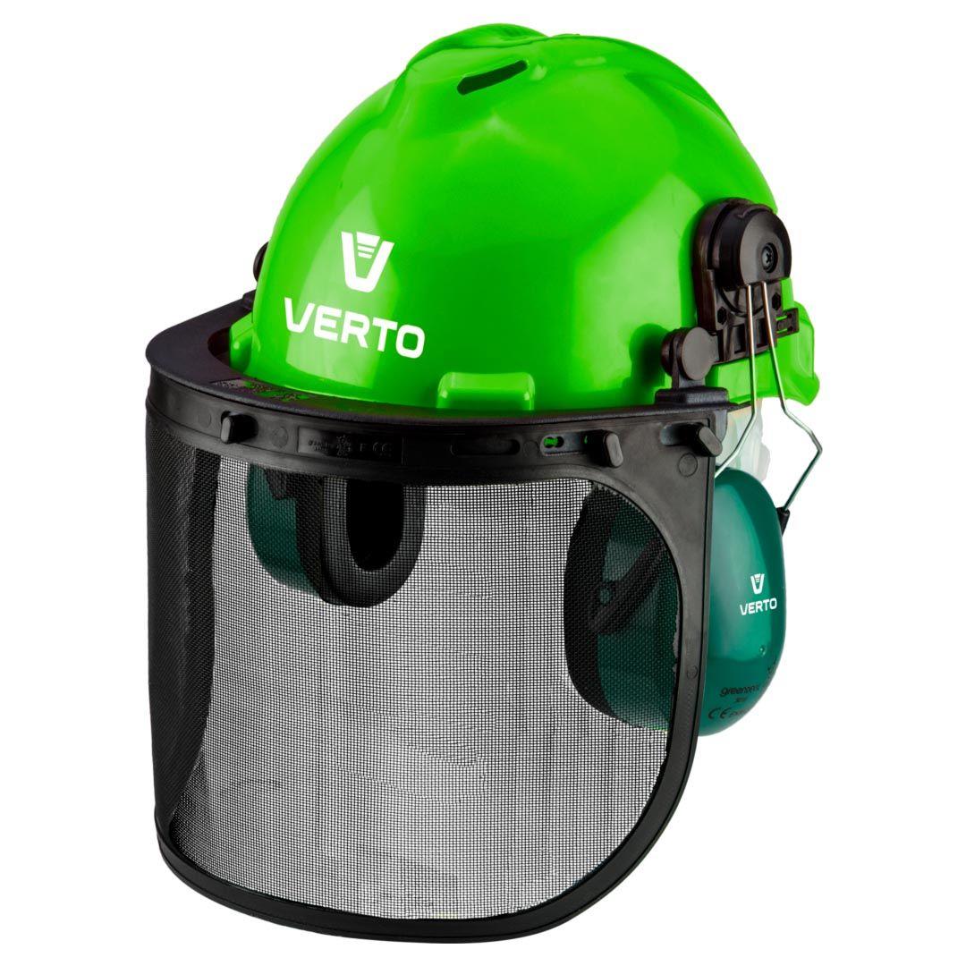 Засіб захисту слуху, голови та зору – 3 в 1 VERTO- це універсальний продукт для застосування під час робіт по бензокосарки, ланцюговою пилою і іншим устаткуванням, коли користувачеві потрібен повний обсяг захисту: слуху, голови та зору. Каска виготовлена ?? з високоякісного пластику ABS і обладнана засобом регулювання обсягу чола, дозволяє підганяти розмір. М’яка підкладка навушників підвищує комфорт експлуатації. Козирок для особи виготовлений з металевої сітки і захищає обличчя користувача від дрібних твердих частинок. Маркування CE – це гарантія безпеки, яка доводить, що продукт відповідає всім вимогам Європейського Союзу.