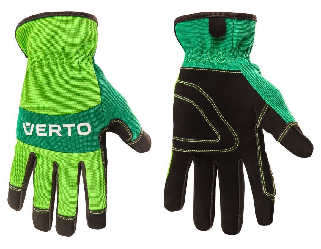 Рукавички робочі, синтетична шкіра, 9" 97H121 VERTO незамінні для захисту рук під час садівництва, DIY або ремонту. Рукавички виготовлені з екологічної штучної шкіри, мають практичні вставки з ПВХ, які додатково захищають задню частину тильної сторони долоні проти травм.