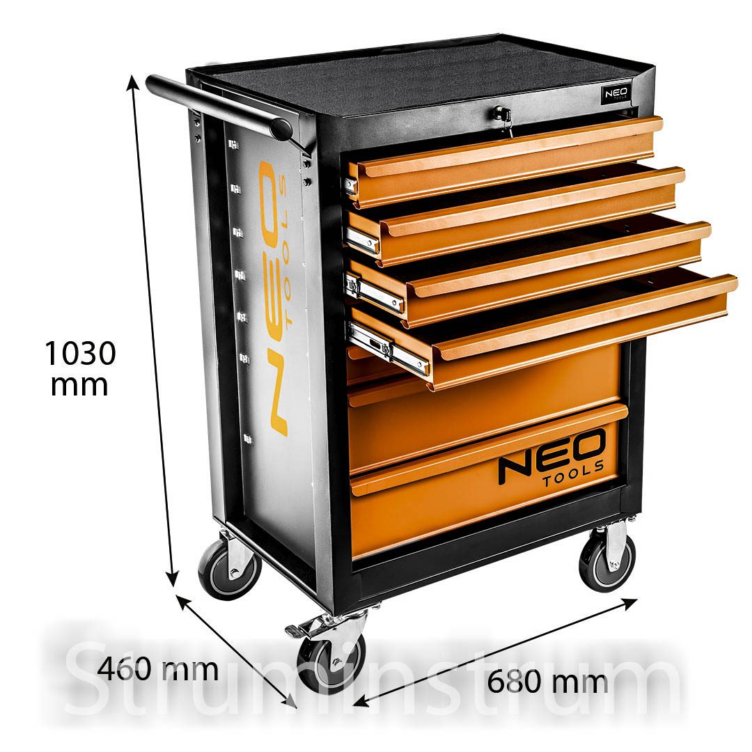 NEO TOOLS 84-222-9 — інструментальний візок-шафа зі сталевим корпусом, розмірами 680 x 460 x 1030 мм та вантажопідйомністю 280 кг. Оснащена 7 висувними шухлядами на роликах із шарикопідшипниками, центральним замком та гумовим покриттям зверху. Має колеса 5″ з блокуванням і бокову ручку для транспортування. У комплекті — 129 інструментів та два ключі.